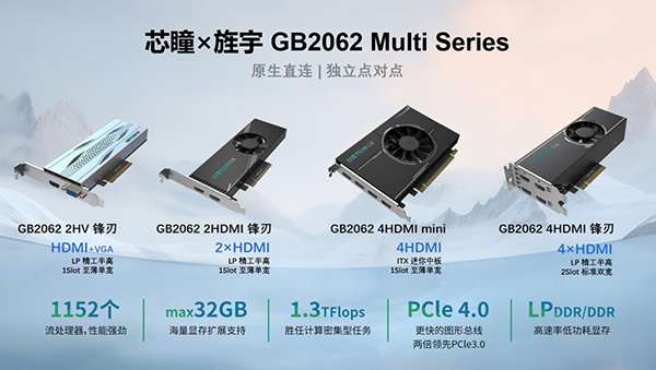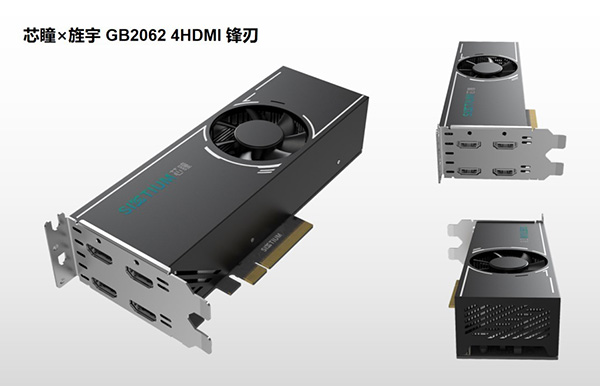 根据芯瞳与旌宇的合作发展战略,针对后者成功的多屏商显、工业显控、行业定制化、通路消费应用的板级市场经验,基于第二代GB2062 GPU芯片,首先推出四款多屏显卡,这是中国国产化显卡领域的第一个多屏显控概念显卡产品矩阵,这也代表着芯瞳正式进入市场化着陆应用阶段。首批上市新品,分别是GB2062 4HDMI mini、GB2062 4HDMI LP、GB2062 2HDMI LP和GB2062 2HV LP。