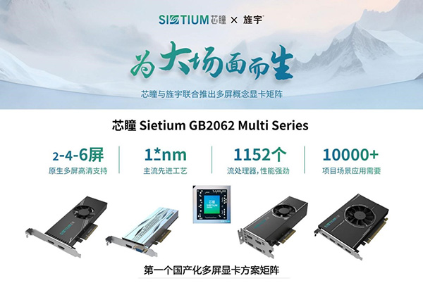 9月28日,国产自主研发GPU芯片设计翘楚芯瞳(Sietium)与知名的显卡老厂牌-旌宇共同宣布,双方达成战略合作伙伴关系,展开全方位深度合作。该联手标志着中国国产GPU芯片首次获得主流显卡厂牌“认证”,具有里程碑式意义。与此同时,也宣告芯瞳自主研发的第二代国产化GPU(图形处理器)——GB2062成功实现市场化,这也是双方创新联合推出的国内第一个国产化多屏显卡产品矩阵,将率先满足交通航运、矿业能源、教育演示、金融证券、安防监控、工业生产指引、文化数字展览、商用财税办公等等多屏显示应用场景。