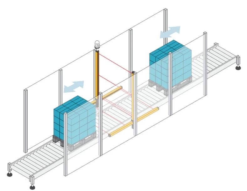 L型屏蔽需要有两个独立的传感器,还有主角垂直安装的光栅(由发射端和接收端组成)。需要强调的是,L型屏蔽只能应用于物料从危险区域往外输送的场景,也就是输送轨迹只能是单方向的。