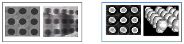 相同锡膏的 2D X射线图像(左)和 3D X射线图像(右)