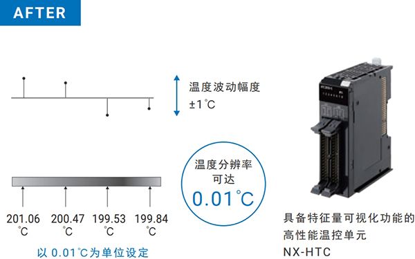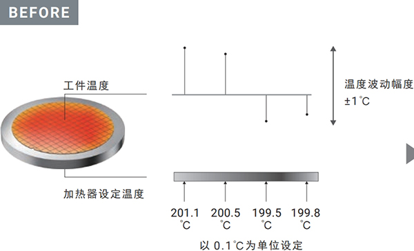 以往,为抑制温度波动,需要多个加热器,配置工作非常耗时。高精度温控可以最大程度地抑制影响品质的温度波动,从而维持生产效率。