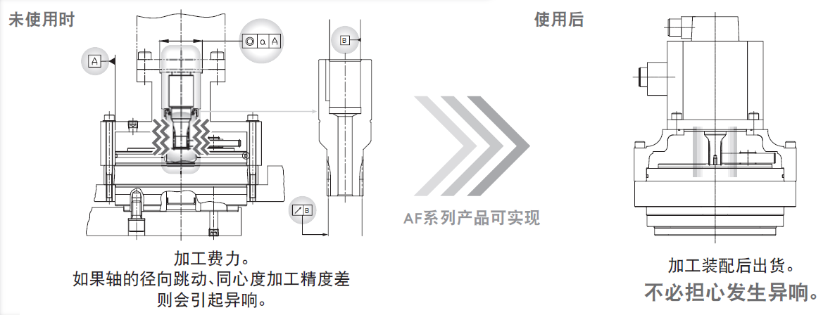 纳博特斯克为了尽可能帮助用户加快实现工厂自动化,研发了预封入润滑脂的【紧凑型执行器AF系列】,其核心组成是精密减速机RV™和松下电器产业株式会社的伺服电机。