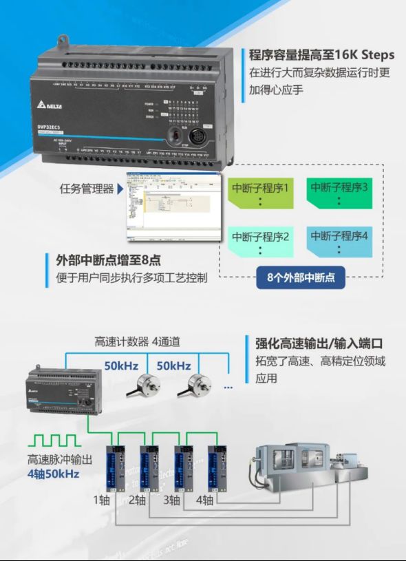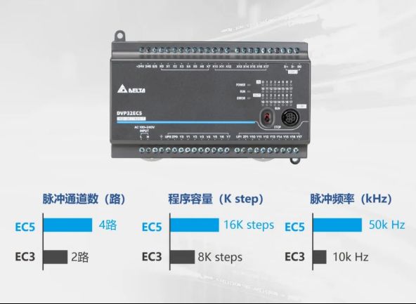 为响应行业市场工艺升级的需求,台达推出新款升级机型DVP-EC5系列,延续DVP-EC3系列简单易用的特点,优化控制器的处理能力,助力用户提升设备竞争力。