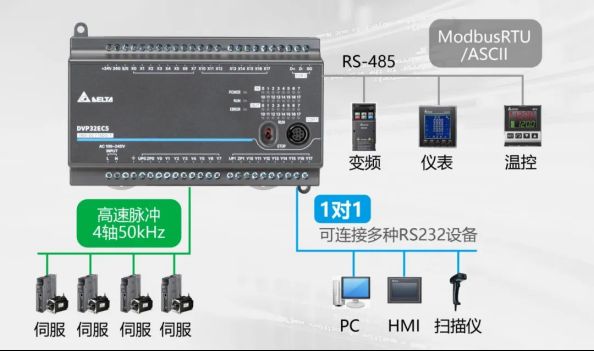 作为设备的控制大脑,快速方便地与周边设备进行数据交换与传输,同样是衡量控制器品质的重要因素。DVP-EC5拥有1组RS-232和1组RS-485通讯端口,支持串口通讯、Modbus通讯,可快速整合伺服系统、变频器、仪表、条形码扫描仪等周边设备,实现一体化控制。