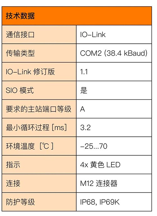 微米级高精度测距,通过IO-Link提供距离值。在ifm IIoT平台moneo中可进行简单的1点校准或更精确的3点校准,确保更换目标材料时,检测依然快速可靠。