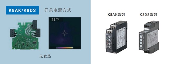 以往的普通反相缺相继电器等采用了电容分压回路方式,因此会受变频噪音影响发热。K8AK/K8DS系列的电源方式采用开关电源方式。不会受变频器噪声等影响发热,因此可以放心、安全地使用。