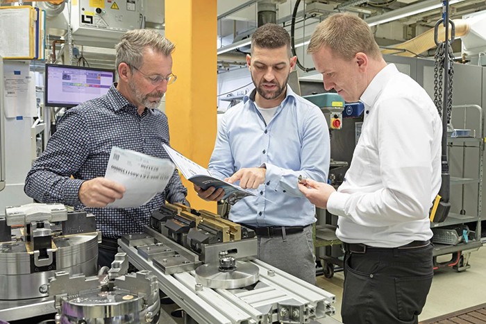 从左至右:WIKA机加工车间负责人Michael Balles,德国雄克工件夹持技术咨询及销售Benjamin Rausch和WIKA工艺部门经理Alexander Nachtwey博士