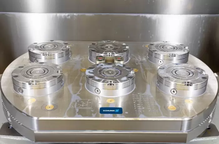 在雄克为WIKA提供的夹持方案中,与机床工作台的接口由6个NSE3模块组成的零点快换工位,NSE3模块可选配中心密封短锥,当拉钉抬出后,模块接口会自动锁定闭合,防止切屑和污物进入。