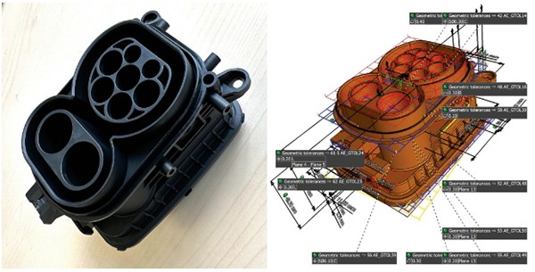图2B:(右)充电口的CAD模型,带有列出公差的PMI质量注释。无需从Creo进行数据转换; 详细的CAD PMI会直接自动导入到VGMETROLOGY中。图片由泰科电子提供