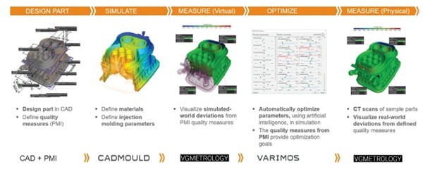 图3:虚拟和物理质量工作流程-(左至右)设计零件并定义质量测量信息;根据需要生成数字报告和模拟反馈以进行设计;从PMI进行可视化和评估零件;在模拟和扫描程序中使用人工智能来优化参数;CT扫描样品零件以发现零件的实际信差。设计后:准备在线检测模饭,并进行扫描、分析和评估。生产后:分析现场退回零件并提供设计反馈,实现持续改进。图片由泰科电子提供。