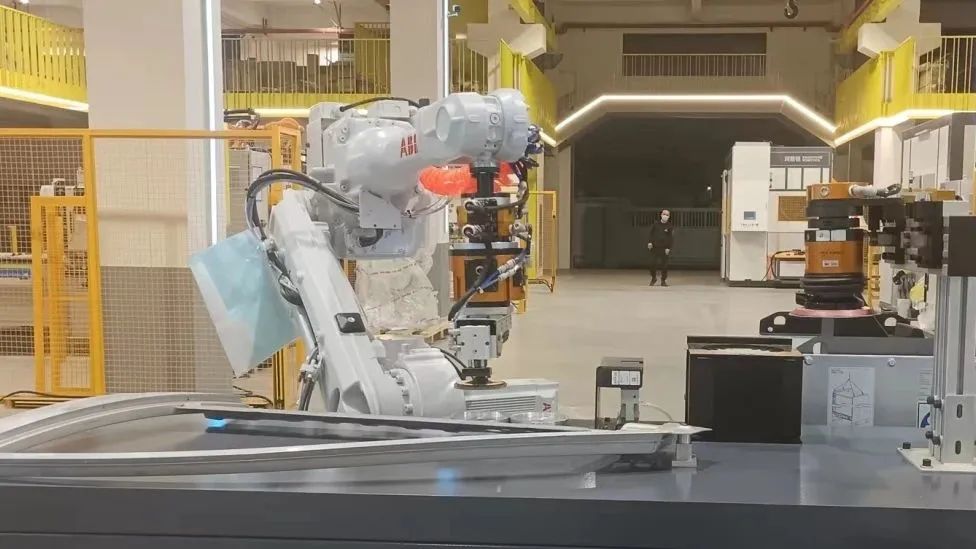 该工作站采用ABB机器人本体系统搭载ATI的工具快换装置QC22、轴向浮动打磨产品PCFC和AOV对汽车门框焊缝进行打磨抛光处理。PCFC自带重力补偿功能和浮动行程指示功能,连接可自动更换砂碟的角磨机对焊缝余量进行磨削去除;气动驱动的AOV浮动机构允许动态控制接触力,无论空间姿态如何,双向浮动控制同样具备抵消工具自重的功能,以确保打磨效果的一致性,并且AOV也可实现自动更换砂纸,使整个打磨过程更加自动化、智能化、高效化,安全可靠。