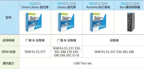 因应不同的使用场景及应用深度,台达的DIASECS 系列有四种产品可以选择:DIASECS Driver Library、DIASECS-GEM Library、DIASECS-GEM Runtime、DIASECS-GEM Box。