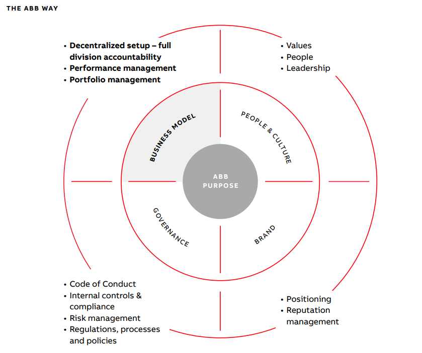 ABB的价值创造模型全面总结了公司为整个价值链中所有利益相关者(包括客户、员工、投资者和供应商)创造的综合价值。该模型概述了ABB创造价值所需的投入,并说明了集团如何通过其垂直化运营模式将这些投入转化为产出和成果。