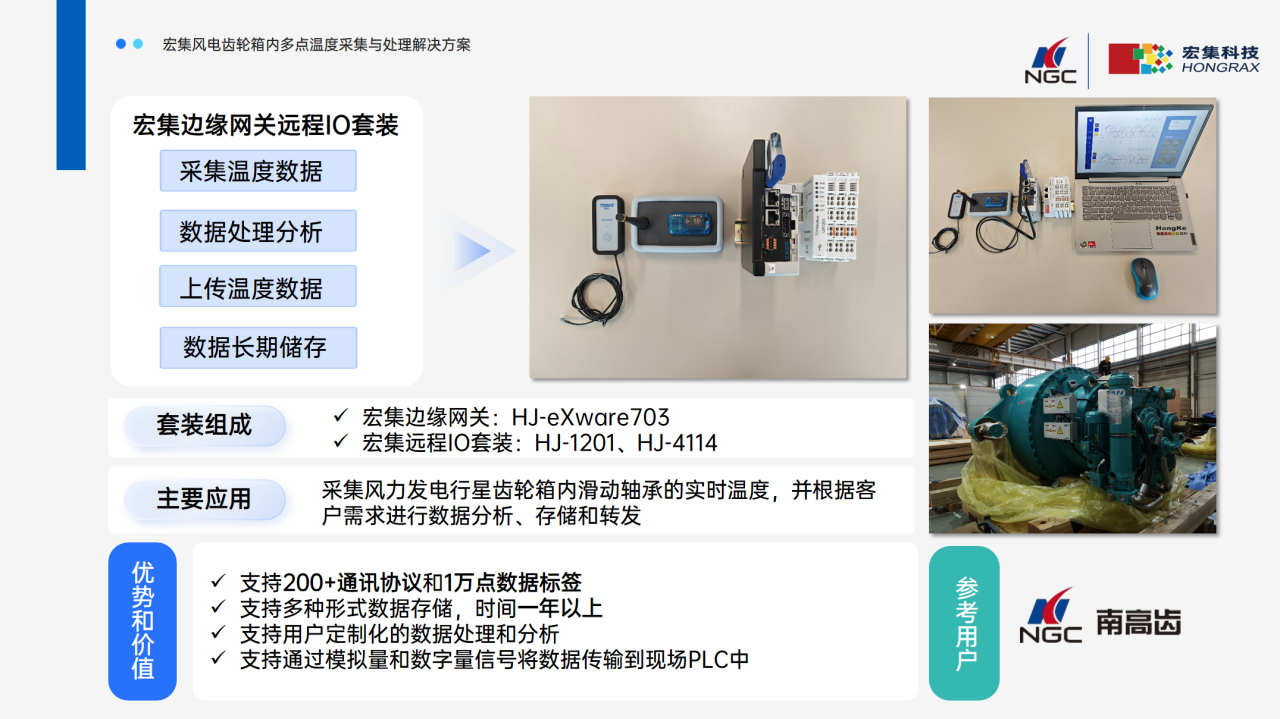 专为采集风力发电行星齿轮箱内滑动轴承的实时温度而设计。该方案提供定制化的数据分析、存储和转发服务,满足客户需求。方案由宏集边缘网关远程IO套装构成,包括宏集边缘网关HJ-eXware703以及宏集远程IO套装HJ-1201、HJ-4114。该套装可高效采集厂家数据记录仪中的齿轮箱温度数据,并通过边缘网关的强大计算能力,实现对风电齿轮箱内多点10分钟均值温度的计算,同时判断最高温度值,并通过远程IO模块将数据传输至现场PLC,实现齿轮箱温度的警报设定与通知。
