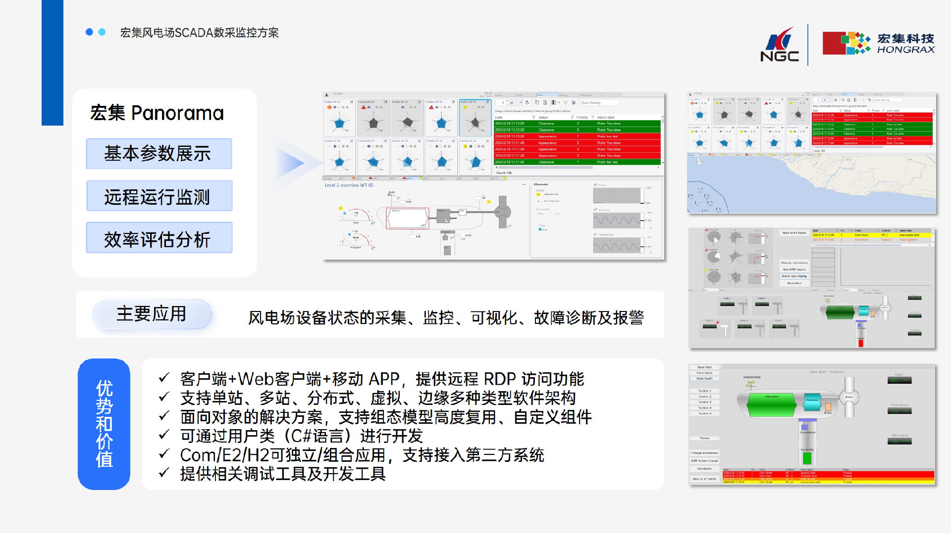 宏集风电场SCADA数采监控方案专为风电场设备状态的采集、监控、可视化、故障诊断及报警设计。该方案以宏集 Panorama 软件平台为主体,可实现风电场风机组中风速、功率、转速等基本参数的展示。用户可以通过远程控制单个或多个风机的启停,实时监视风机的运行状况,同时可以通过对比分析,对每个风机组进行效率评估。
