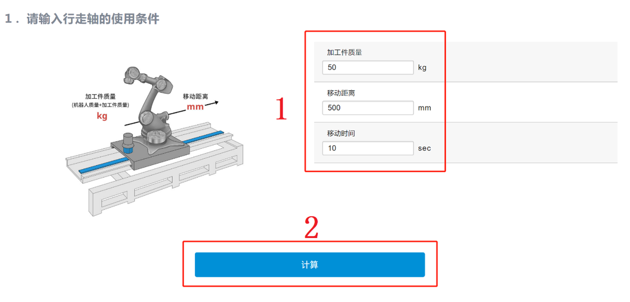 只要输入选型条件,就可以对 “减速器+齿轮&齿条” 同时选型的系统,这在行业内也很少见吧。最重要的是,输入条件只有“加工件质量”、“移动距离”、“移动时间”这3个,就非常简单方便。