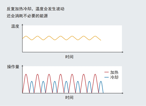 设备的加热和冷却能力差异较大,很难找到适合的加热和冷却PID。因此,调整需要花费时间,而且由于PID不合适,过分冷却引起的温度和操作量波动会导致品质不良和电力浪费。