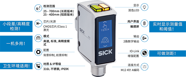 现在,在有无检测型光电和距离测量型光电之间,W10给您更加无缝的选择,当您的设备需要进行小段差、复杂表面检测,但又不需要高至微米级别的精度时,不妨试试SICK全新W10,一起体验触摸屏的简洁与强大!