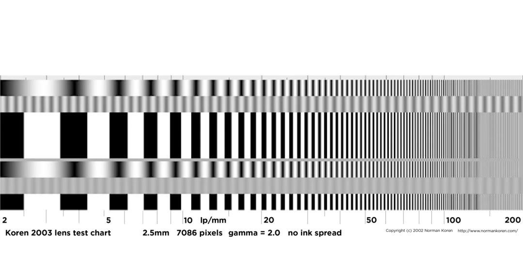 X轴(水平方向)表示每毫米周期上的空间频率,该单位的缩写为lp/mm,表示每毫米的线对数(线对即一条黑线和一条白线)。