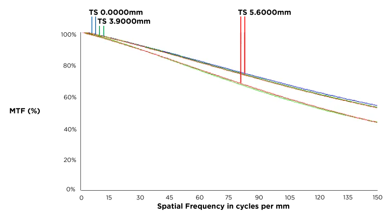 使用不同颜色绘制多条线,它们分别代表沿着镜头曲率的不同点位(例如,0.0000 mm是指成像中心,而5.5000 mm是指距离成像中心5.5 mm的位置)。