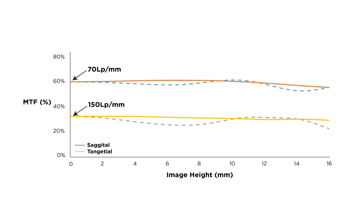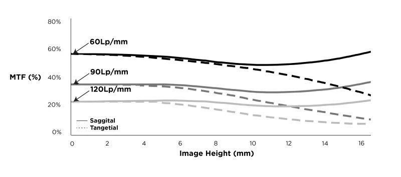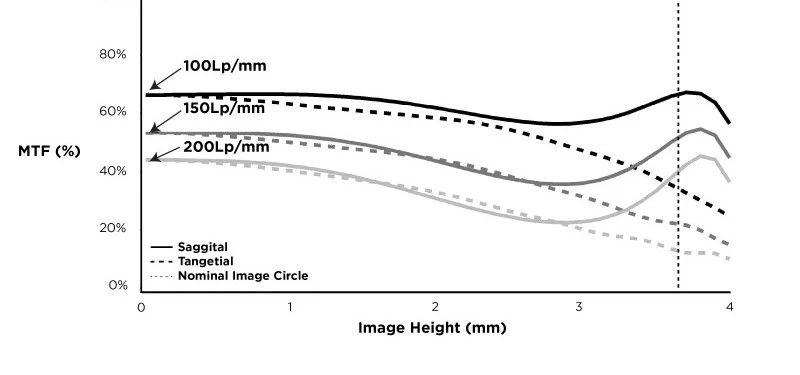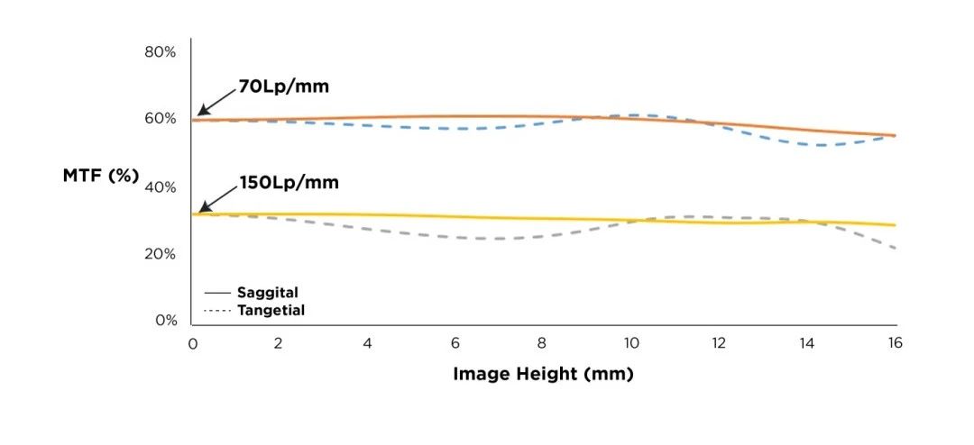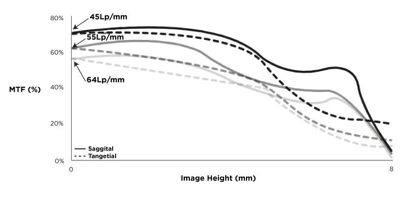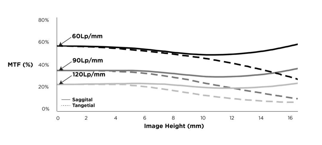 感光芯片各个位置的表现:MTF图可让您深入了解镜头在整幅图像中的表现,助您选出符合要求的镜头,保证从成像中心到边缘都能获得一致的成像质量。