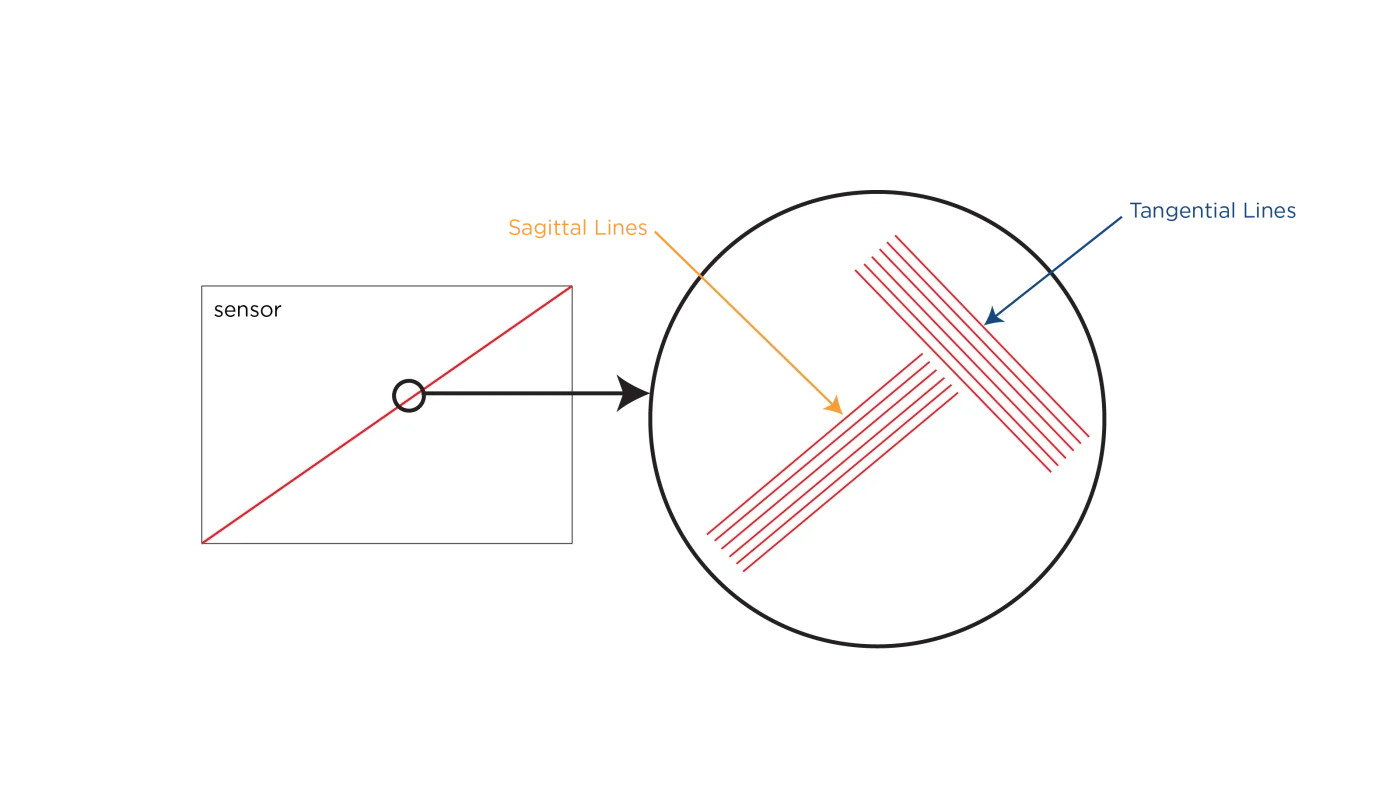 典型的MTF图包括切线(T)和矢状线(S)。切线(T)也被称为经线,它以实线显示切向MTF测量值,虚线则显示的是矢状MTF测量值。矢状线表示测试图案的线与一条从像圈中心延伸到角落的线保持平行,而切线则垂直于这条对角线。通常,实线的MTF值较高,因为镜头通常是根据切线方向来制造的。