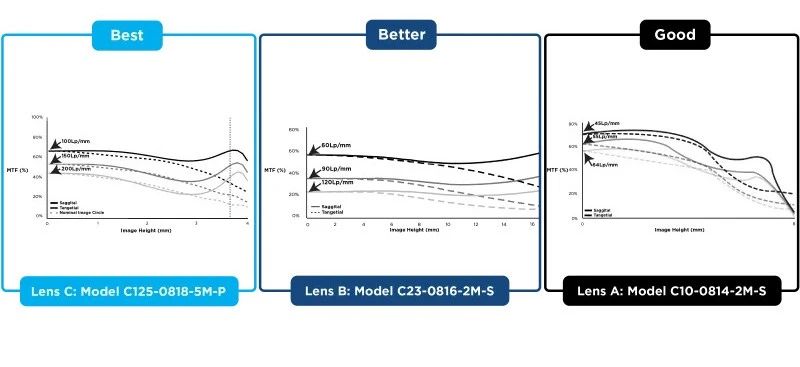MTF可以衡量镜头在特定分辨率下保持对比度的能力,并用图形表示,以便于用户解读。不妨学习如何看懂MTF图,比较镜头的分辨能力,优化您的选型。