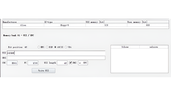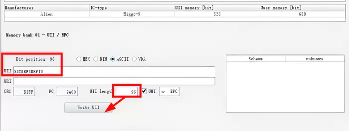 为了便于用户操作,我们这里定义为UII Length,比如您图上的48bits,我们可以修改为96bits,然后点击WriteUII: