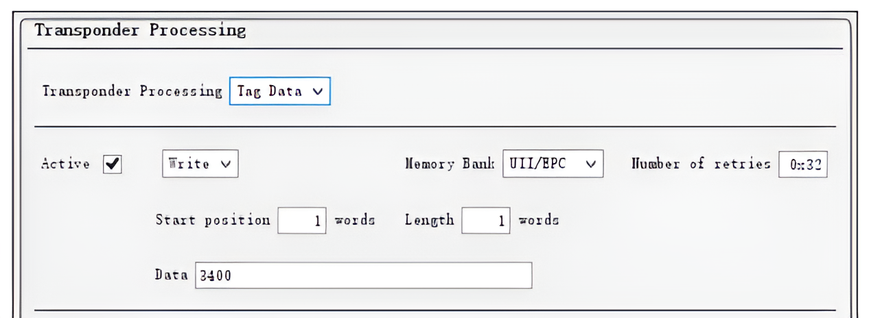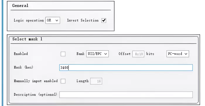 由于读写器写入速度较快,同时为了避免因为快速写入降低标签使用寿命,我们将Tag Select选项打开,中文版本选项为标签Mask选择,选择非3400标签,即逻辑上为当标签长度被修改为需要的长度后,读写器不再对此标签进行重复写入,记得勾选逻辑取反: