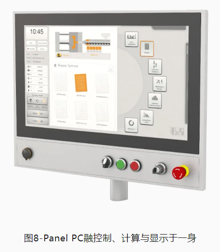 贝加莱的APC系列工控机-采用Intel X86处理器,但其Automation Runtime和Windows均可独立运行。这样Windows任务的HMI操作、Web服务、通信等任务都在Windows下。而RTOS仍然执行PLC的任务。当然,机器制造商也仍然更喜欢HMI与控制集成的控制系统。因此,贝加莱Panel PC系列又得到了青睐,如图8。