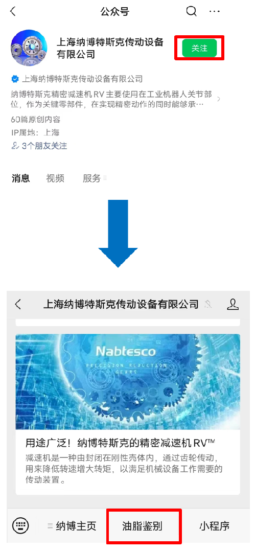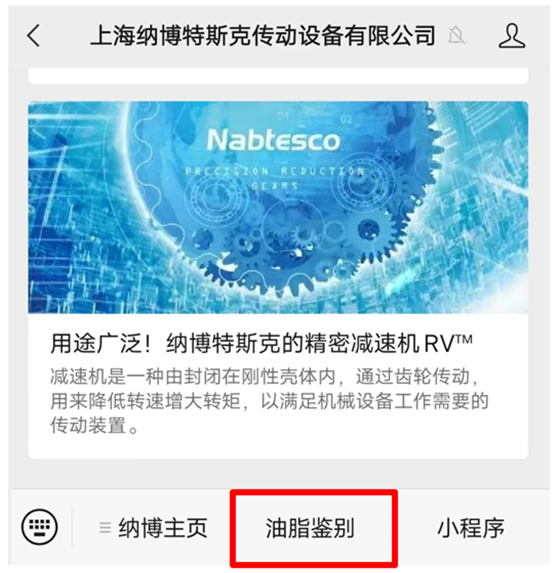 为了保障用户购买到正规品纳博特斯克精密减速机RV™专用润滑剂,上海纳博特斯克传动设备有限公司制作了油脂鉴别标签,并在正品润滑剂产品出货时,贴于油桶的封口处。请用户通过官方微信公众号的【油脂鉴别】功能进行扫码验证。验证方式请参考下文【油脂鉴别流程】。