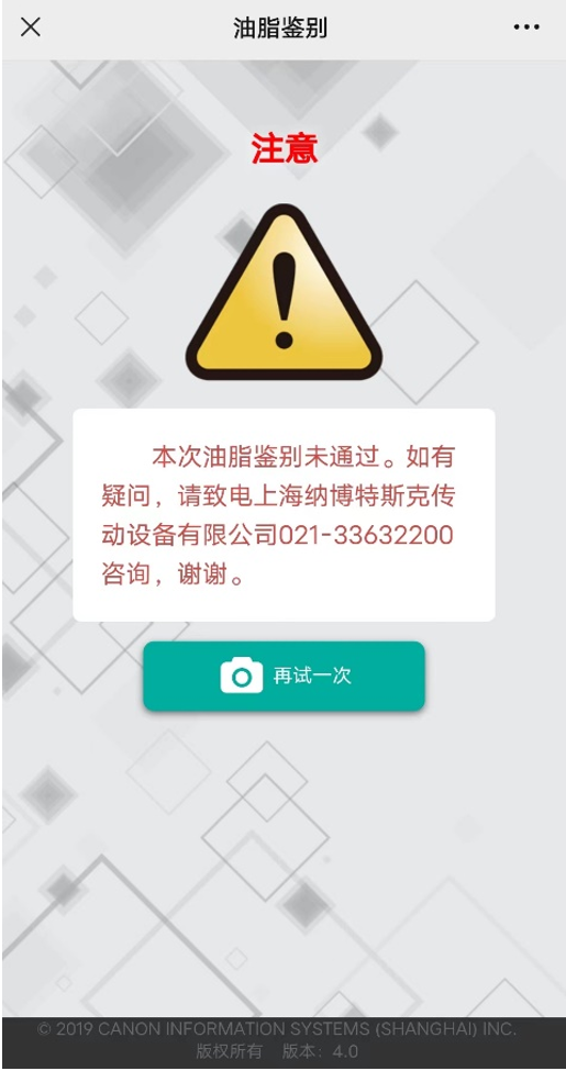 如遇到扫码无法进入“上海纳博特斯克传动设备有限公司”官方公众号的,则该张标签有被仿冒造假的风险。请勿开封使用,尽快联系我司。