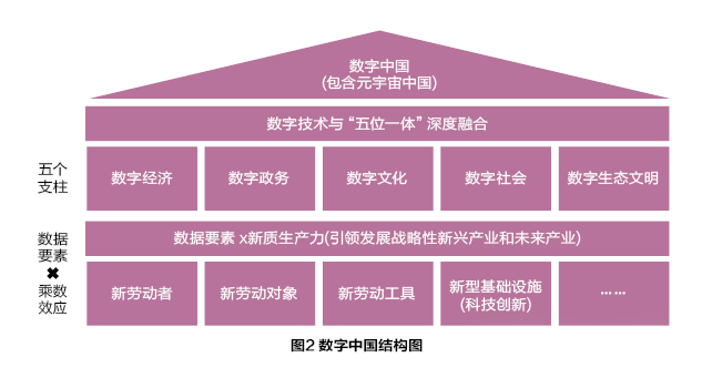数字中国建设按照“2522”的整体框架进行布局,即夯实数字基础设施和数据资源体系“两大基础”,推进数字技术与经济、政治、文化、社会、生态文明建设“五位一体”深度融合,强化数字技术创新体系和数字安全屏障“两大能力”,优化数字化发展国内国际“两个环境”。在融通数据要素、元宇宙和新质生产力后有了新的认识。