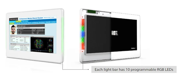 IASO-W10B-N6210具有明亮简洁的外观,两侧均带有可编程 LED 灯。彩色灯光和显示可根据使用条件进行调整。可用于帮助医疗人员快速检测病患状态灯信号和警告病房通道。前框采用半透明材料,可减少边框的重量的同时让灯条显示更清晰。