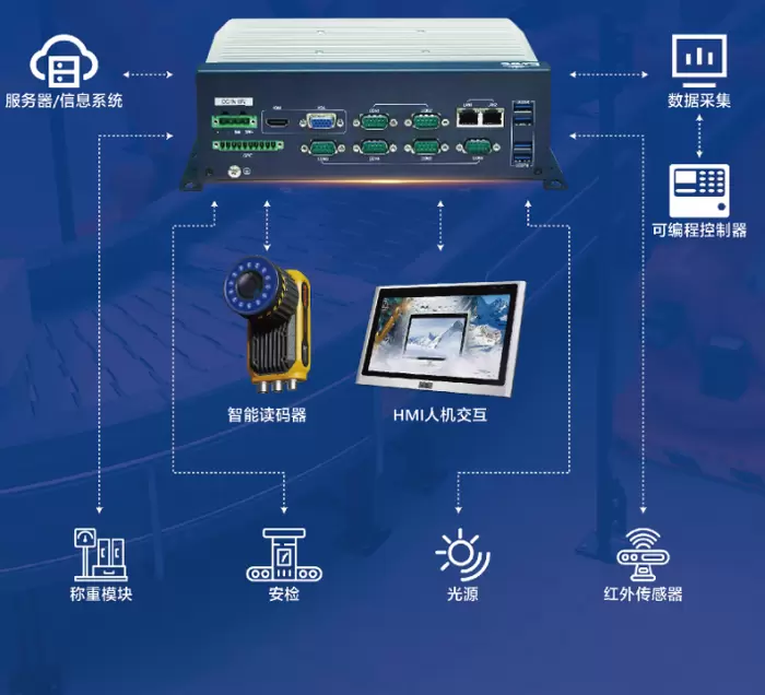 研祥智能M60A工控机在物流行业的应用主要包括智能仓储、智能分拣拣选、智能搬运输送等环节。它主要实现数据采集与控制、数据运算等功能,并结合深度学习算法技术,精准识别分离堆叠包裹、货物重量体积收集,实现边缘融合、边缘高速检测应用,识别准确率能达到99.9%以上。