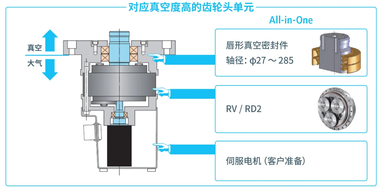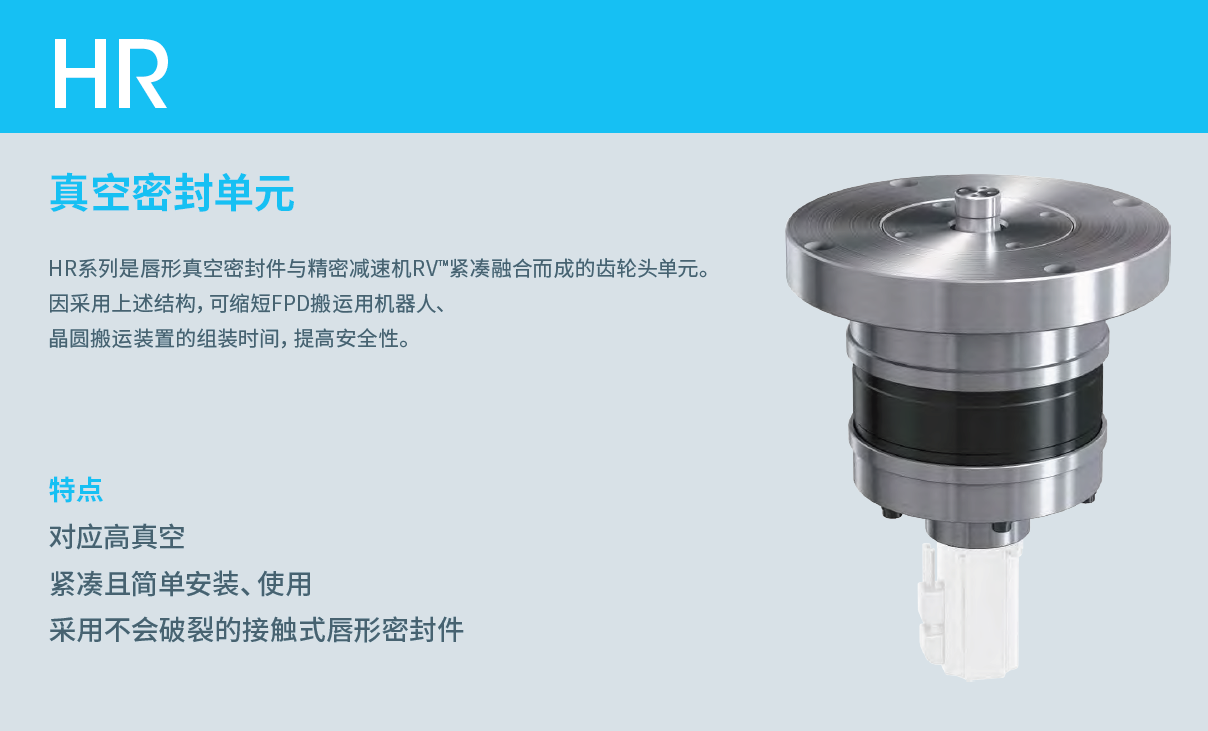 纳博特斯克为了满足真空晶圆搬送设备的洁净度和稳定性需求,推出了唇形真空密封件与精密减速机RV™紧凑融合而成的齿轮头单元——HR系列。该系列产品因采用不会破裂的接触式唇形密封件,结构紧凑,且安装、使用方便,可有效缩短FPD搬运用机器人、晶圆搬运装置的组装时间,且有相当高的安全性。