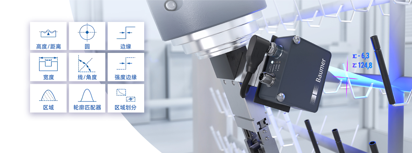与智能视觉传感器相比,堡盟智能2D轮廓传感器更加适用于边缘、间隙(凹槽)、电缆或管道直径等环境复杂位置苛刻的检测,甚至是对各种不规则的随意形状执行可靠且准确的检测定位。