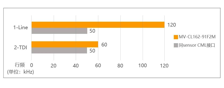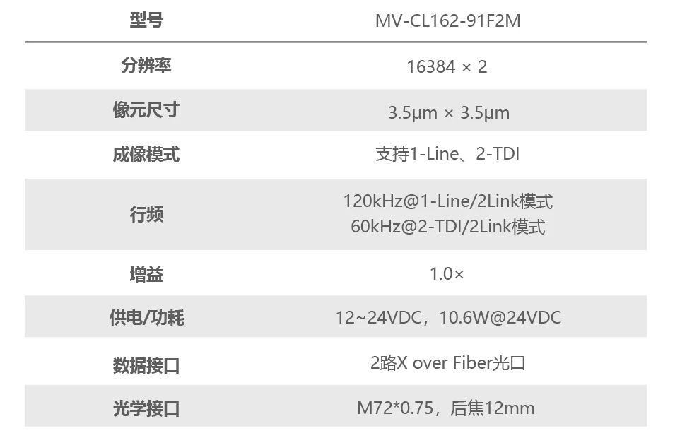 相机(MV-CL162-91F2M)采用两线COMS Sensor,支持2-TDI成像,且在开启2-TDI后可保持60kHz行频高速采集,兼顾高速采集和亮度提升,降低视觉系统对环境光源的要求。