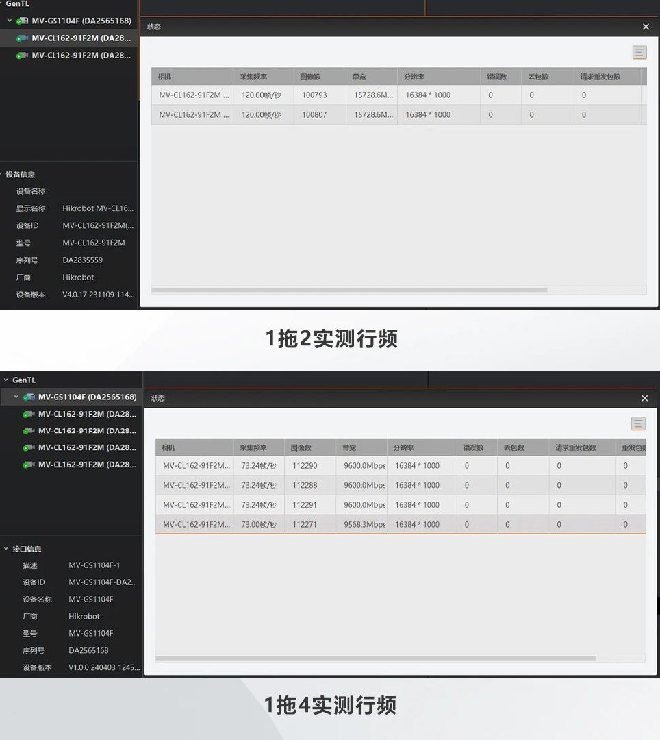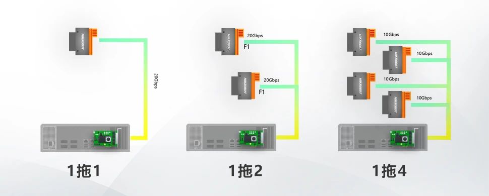 海康机器人推出了不同XoFLink接口数量的配套采集卡,搭配相机自身支持的1Link和2Link两种工作模式,可支持1拖1、1拖2、1拖4等多种连接方式,安装便捷。客户可根据对行频及整套方案的架设需求灵活选择拓扑连接模式。