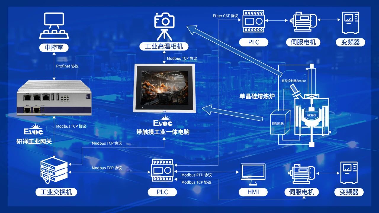 电力脱碳势在必行,以光伏为代表的清洁能源在近十余年发展迅猛。单晶硅是太阳能光伏电池的核心硬件材料,在其熔炼过程中,研祥智能的工业一体电脑担当起核心控制单元、关键人机交互媒介、智能管理平台的角色。