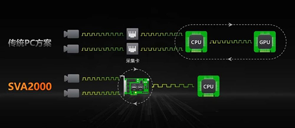 数据流无需经过CPU,在SVA2000上即可完成全部视觉功能,CPU只在有需要时做少量的控制功能,大大降低了CPU负载,在某些应用中甚至不需要CPU参与工作。