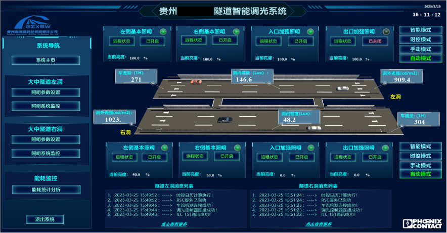 菲尼克斯电气与广州宇象合作完成的隧道智能照明控制系统,通过随车调光控制的方式,可以大幅减少照明电费开支,并且可以通过多种方式对隧道供电设施、照明灯具等设备的运行状态进行检测,发现设备故障可通过系统平台发出告警,告知维护人员及时处理,提高隧道设施故障响应及时性和设施完好率,以技术手段变被动为主动,减少维护巡查工作量和维保费用。系统同时具备标准的数据接口,可以与运营单位或业主的智慧交通平台对接。