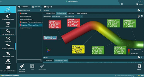 Tubelnspect配备了专业的BendingStudio XT测量软件,它专用于管线零件的检测和生产控制,为用户提供了完整的端到端解决方案。从设计和工艺规划,到生产和质量控制,该软件将与管件生产相关的所有数据和过程进行了紧密结合。BendingStudio XT可以帮助用户快速完成首件检测,通过测量结果的对比分析,可以将修正信息直接发送到弯管机,大大节省了加工材料和人工的浪费。