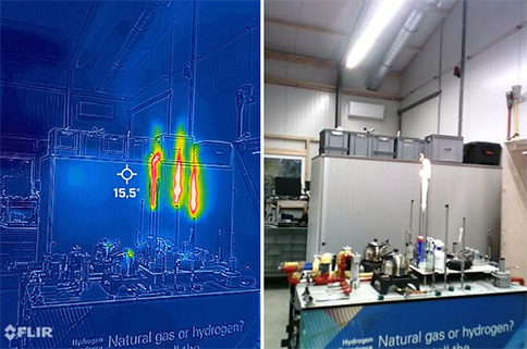 使用天然气和氢气火炬的测试装置:使用视觉相机,氢气火炬几乎不可见。然而,红外热像仪可以根据氢耀斑发出的热辐射来可视化它们。