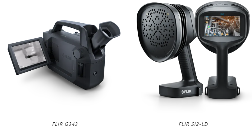 二氧化碳(CO₂) 检测用光学气体成像热像仪FLIR G343和可视化气体泄漏声音的FLIR Si2-LD声学成像仪,它们能帮助监测人员精准定位气体泄漏的位置,甚至泄漏量!