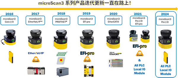 从如下上市历程中,我们可以看出目前microScan3 产品家族包含2个I/O系列,4个安全通讯总线系列以及1个I/O & 安全通讯(SICK EFI-pro)融合系列。