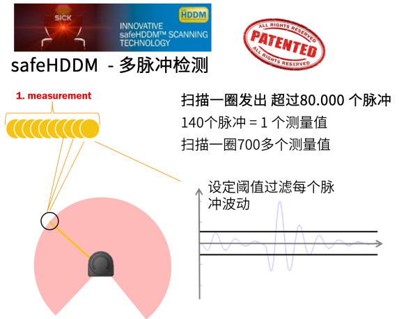 ► microScan3 Pro I/O采用SICK 新一代多脉冲扫描专利技术:safeHDDM™ ,由此带来的突出改进是:安全激光扫描仪在抗干扰性能和测量精度上的质的提升(相对SICK 上一代S系列安全激光提高了4倍)!