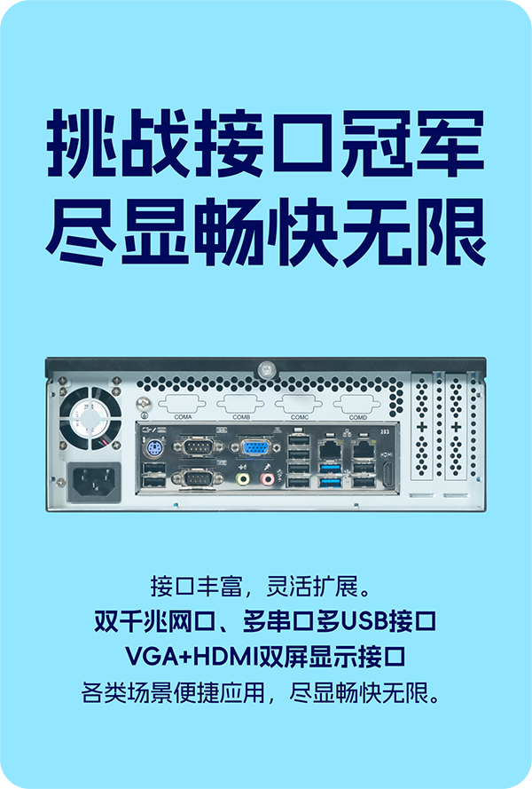 接口丰富,灵活扩展。双千兆网口、多串口多USB接口,VGA+HDMI双屏显示接口,各类场景便捷应用,尽显畅快无限。