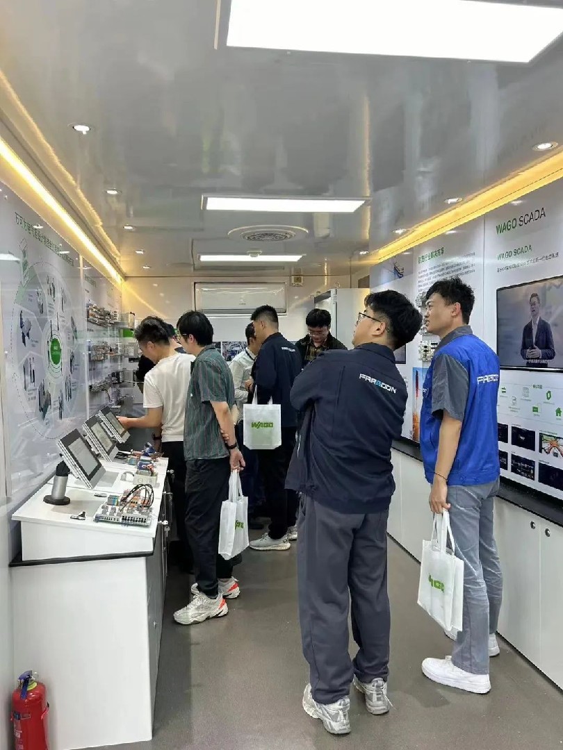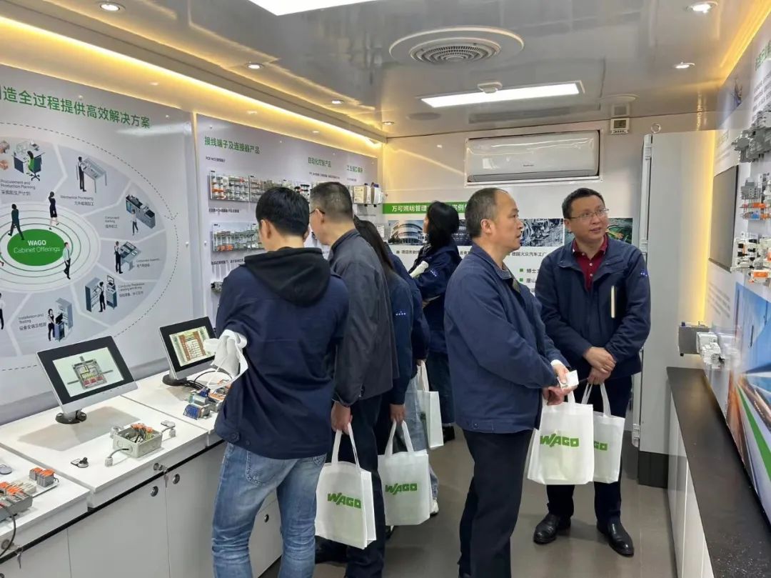 近些年,万可一直聚焦可持续发展,希望以数字化技术助力工业领域的绿色低碳和智能化发展。在数字化移动展厅中,客户可以观看到万可电气连接、自动化控制以及工业接口模块三大类经典产品和2024年新品外,还可以通过VR技术进行万可工厂的云参观。移动展厅内设有楼宇自动化模拟演示、多行业解决方案、WAGO SACDA远程数据采集、产品性能测试、接线体验等多种形式,增强了客户友好体验度。