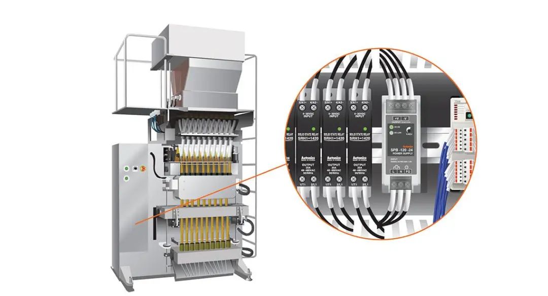 多通道模块型温度控制器,开关电源和固态继电器用于饮料棒包装机中提供电力和控制温度。